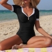 Dive into summer with confidence in this sophisticated one-piece swimsuit. Perfectly blending sporty chic with vintage glamour, this suit features crisp white contrast trim. The thoughtful design focuses on enhancing your natural silhouette, making it an essential addition to your resort wear collection.