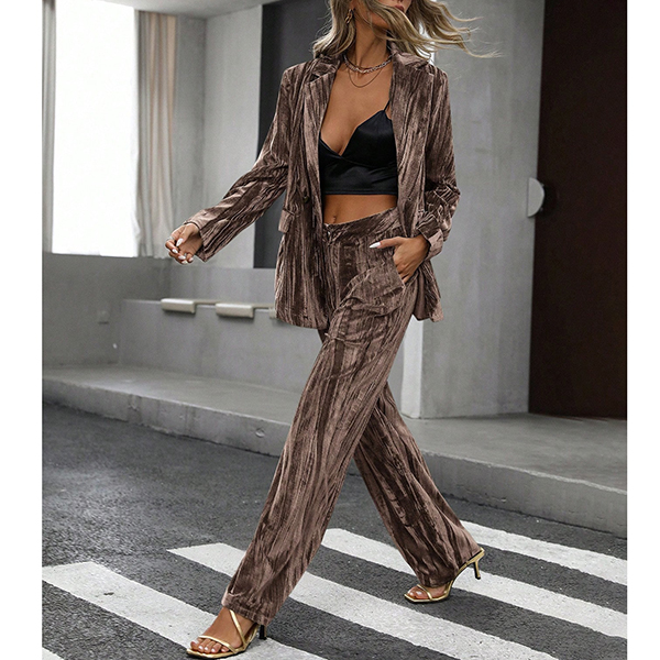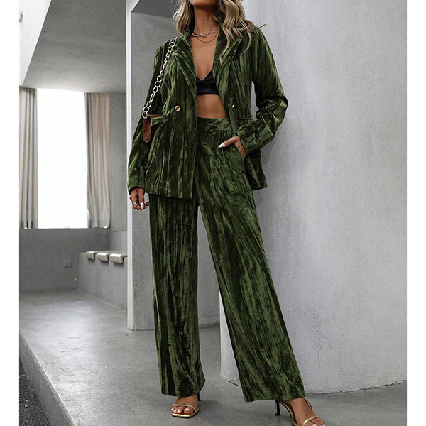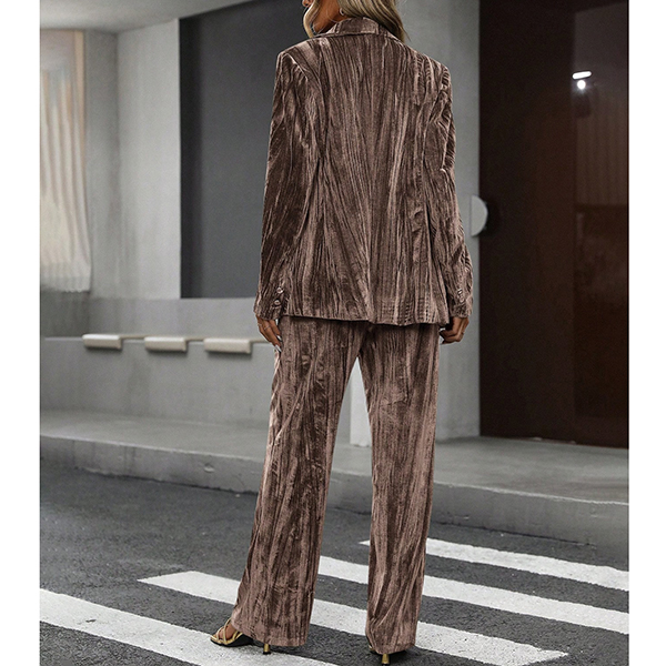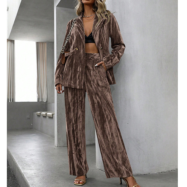 Retro Style Flannel Suit Set with Lapel Double-breated Blazer and Wide-Leg Pants