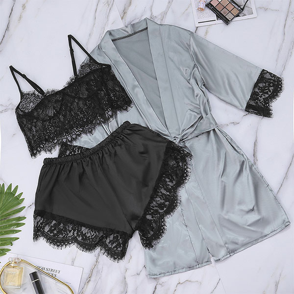 Sexy Lace Spliced Shorts + Sling Crop Top + Robe Nightwear Three-piece Set