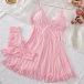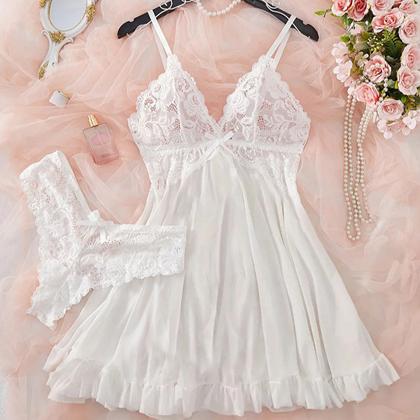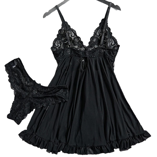 Sexy V-neck Ruffle Hemline Lace Spliced Two-piece Nightwear Slipdress