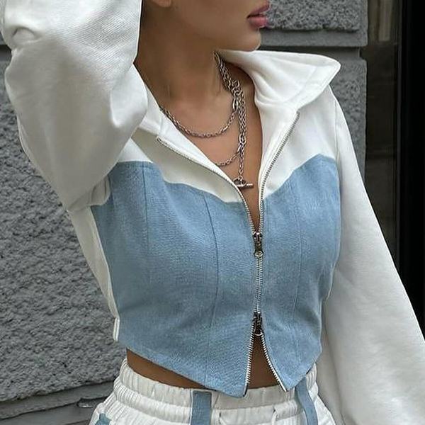 Street Fashion Denim Spliced Two-piece Set Consist of Crop Hooded Sweatjacket and Drawstring Sweatpants