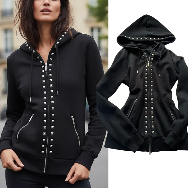 This edgy sweatshirt features urban drawstring hood with bold front zipper closure and striking rivet detailing for contemporary street sophistication. Perfect for urban occasions, contemporary casual styling, or edgy street fashion appeal.