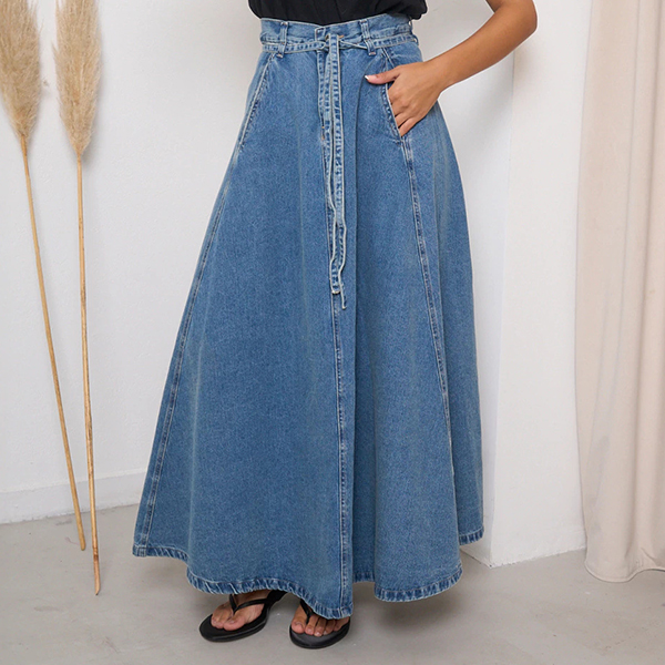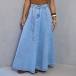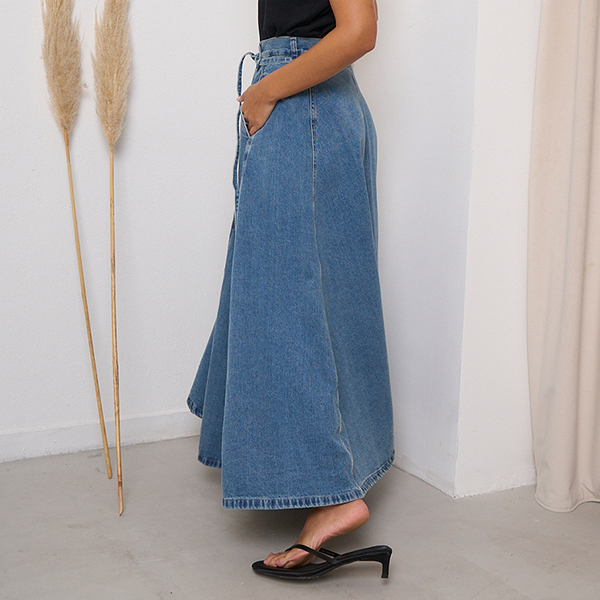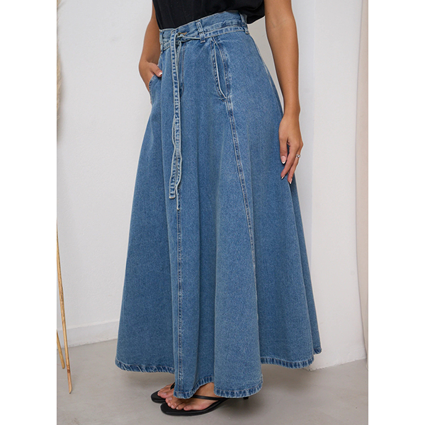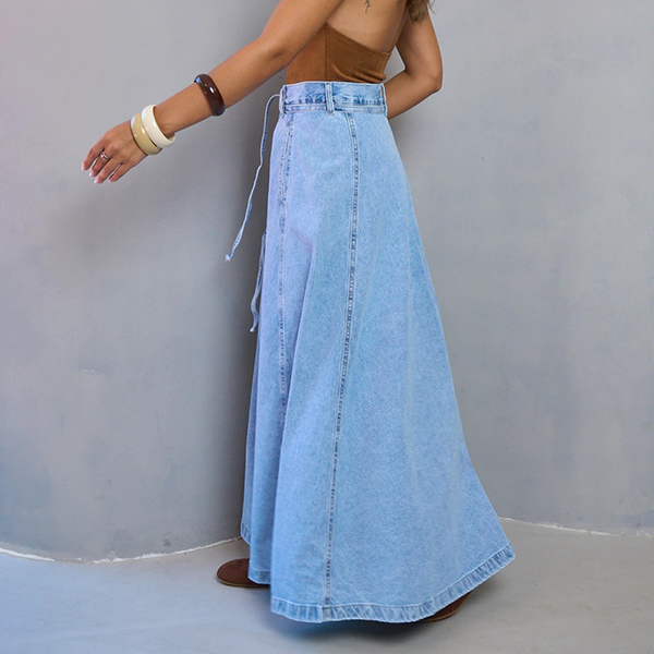 This maxi skirt features street fashion styling with flattering high-rise construction and authentic old-washed denim design for modern urban sophistication. The side pockets provide functional elegance with practical detailing whilst the self-tie feature offers adjustable styling and personalized fit. Perfect for street fashion occasions, urban styling, or contemporary casual coordination.