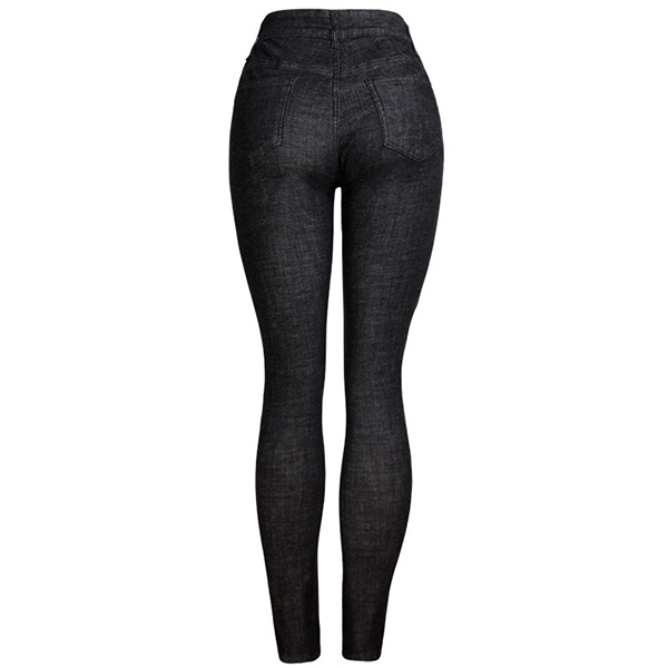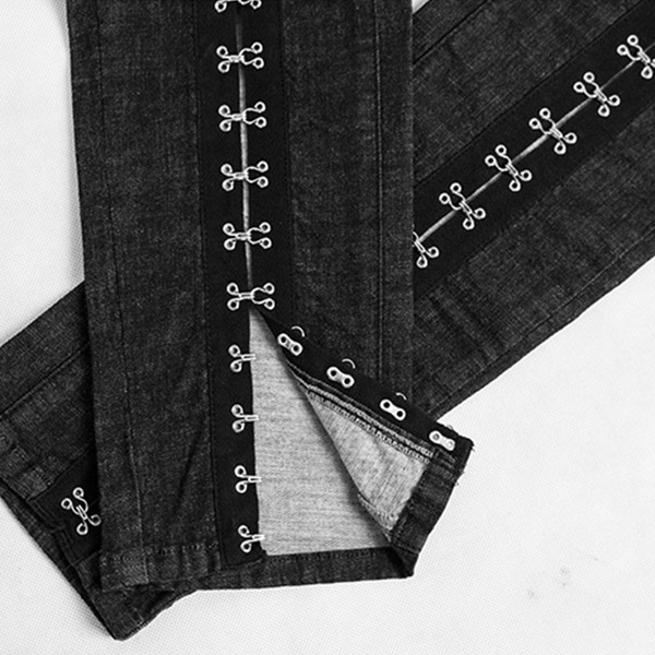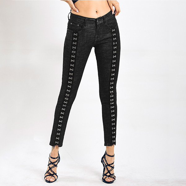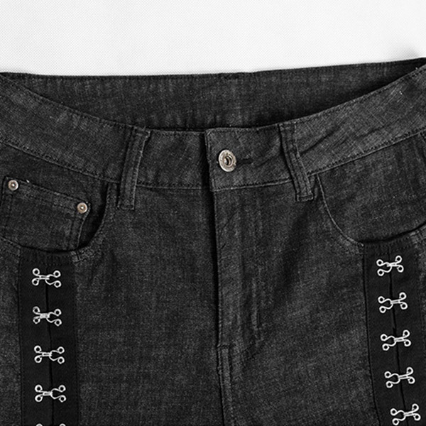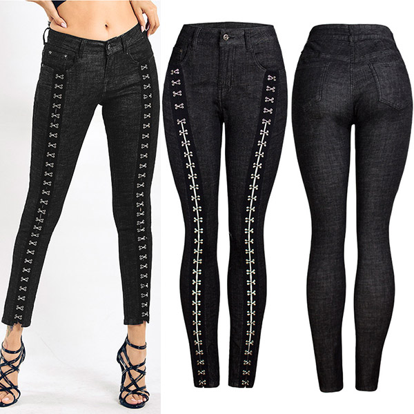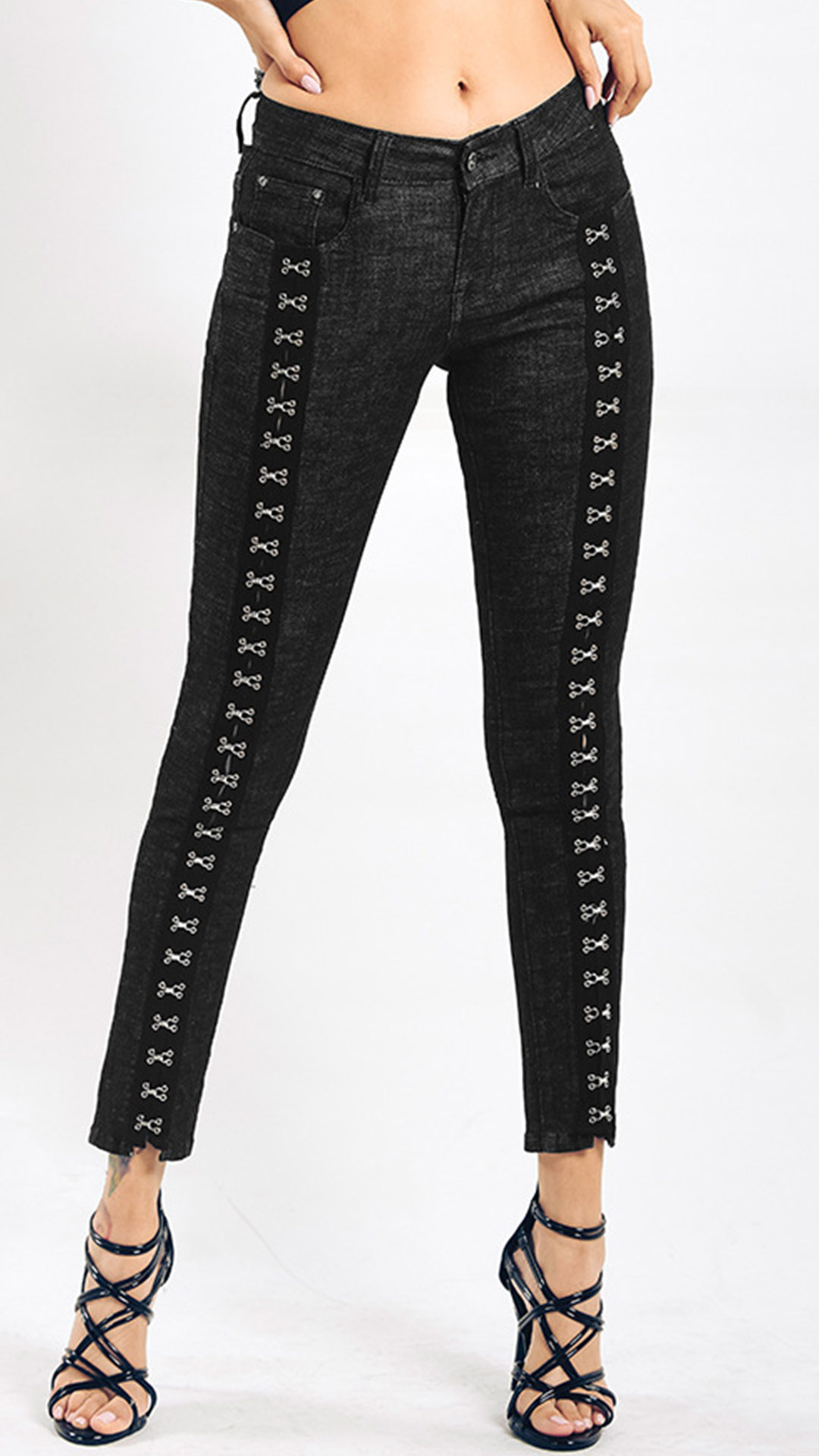 These jeans are perfect for a street fashion look! They are made with a black stretch denim that hugs your curves in all the right places. The rivet button detail adds just the right amount of edge to your look. Also, the rivet button could be a slit design.