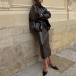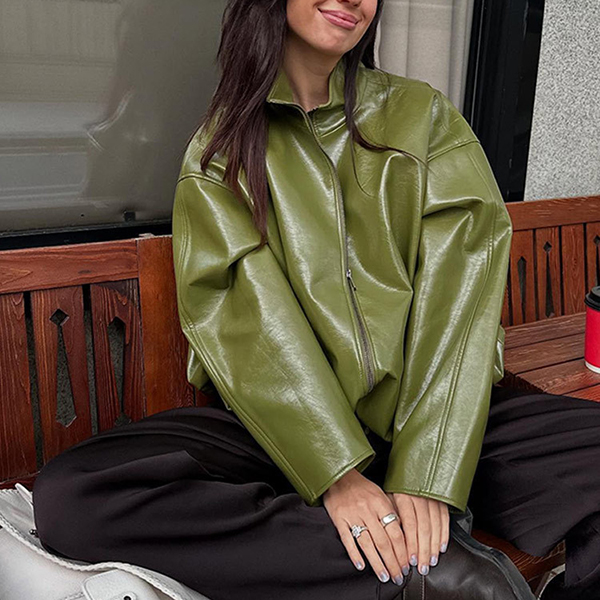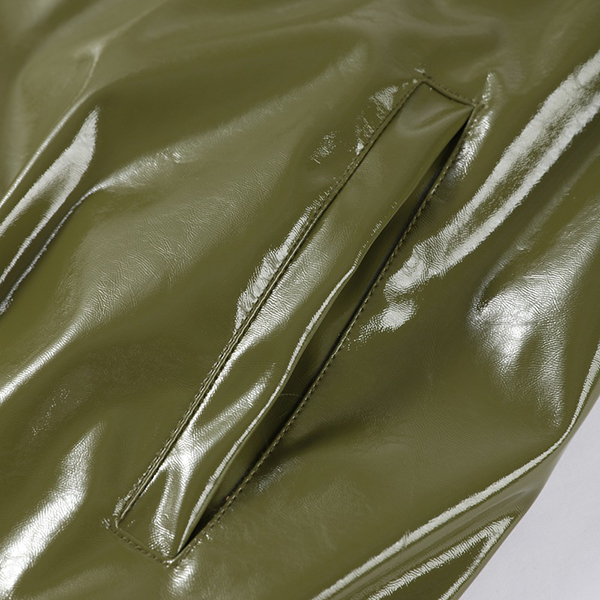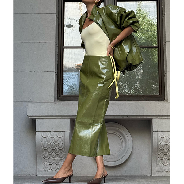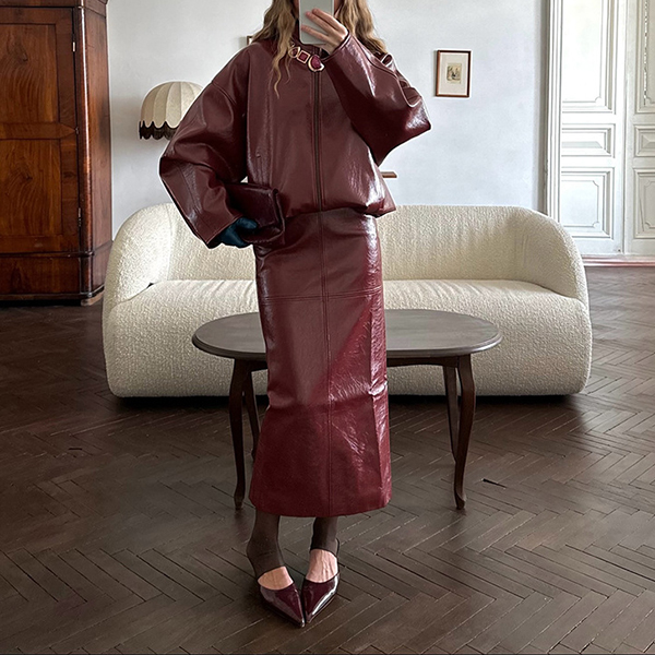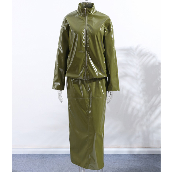 Stylish Artificial Leather PU Two-piece Set Consist of Stand Collar Jacket and Maxi Skirt