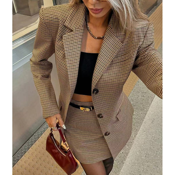 Vintage Houndstooth Pattern Two-piece Set Consist of Notch Lapel Blazer and Mini Skirt