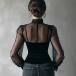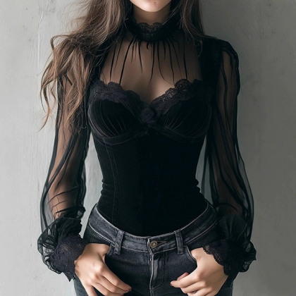This romantic shirt features classic crew neck styling with delicate lace construction and ethereal gauze splicing for vintage-inspired feminine sophistication. The gauze spliced elements provide ethereal transparency with artistic contrast whilst maintaining vintage-inspired proportions and graceful styling. Pair with high-waisted bottoms and vintage accessories for romantic sophisticated appeal.