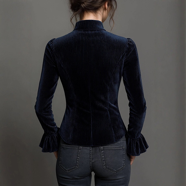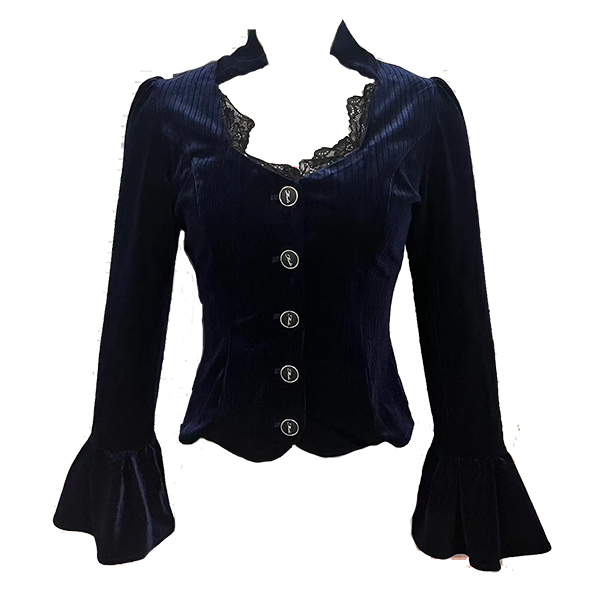 This romantic shirt features elegant V-neck styling with delicate lace splicing and dramatic trumpet sleeves for vintage-inspired feminine sophistication. The irregular hemline adds artistic asymmetry with contemporary edge that showcases the beautiful interplay between romantic lace detailing and dramatic sleeve construction. Pair with high-waisted bottoms and vintage accessories for romantic sophisticated appeal.