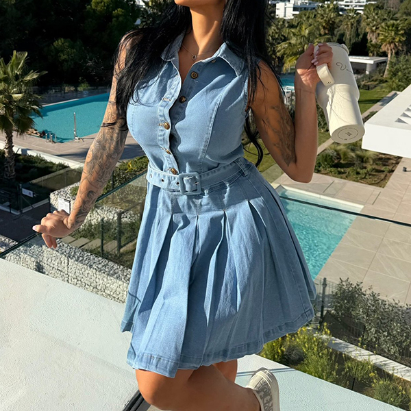 Vintage Lapel Collar Front Button Sleeveless Pleated Hemline Denim Dress with Belt