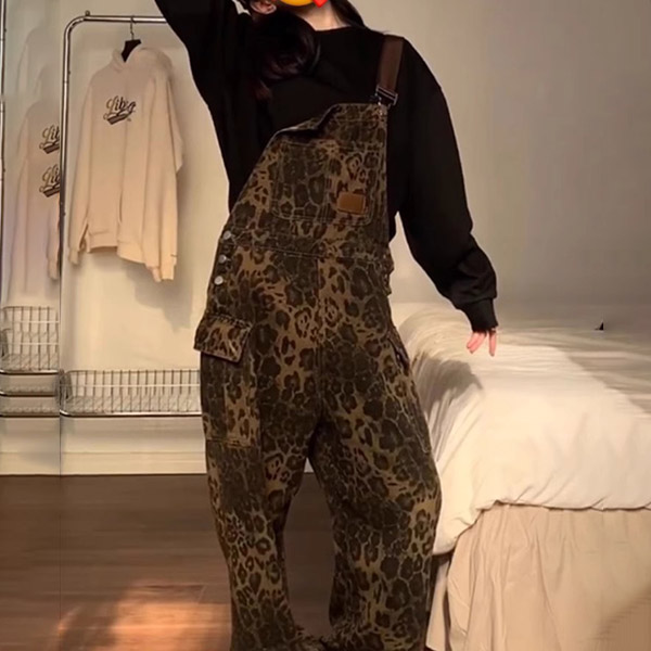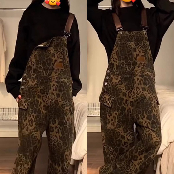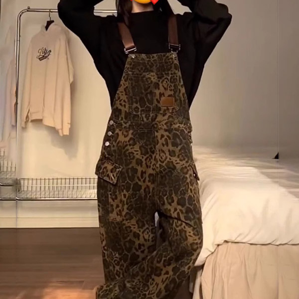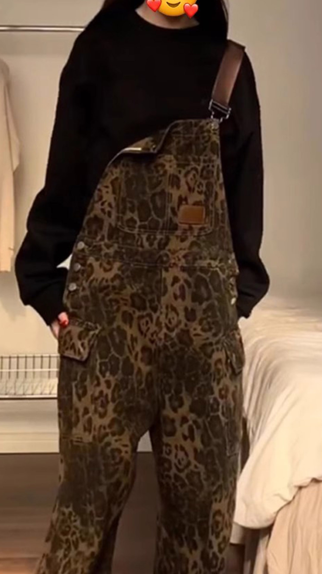 Vintage Leopard Printed Front Patch Pockets Loose Suspender Jumpsuit