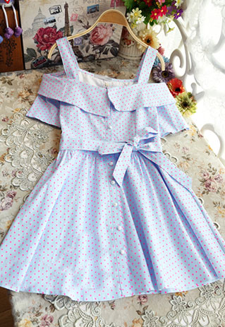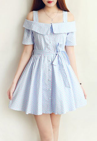 This pretty dress will make you feel like a noble princess.With all-over red polka dots,this off the shoulder dress features a row of beads in the front,fold over details at the bust and a self belt.Finish off with wedge heels.