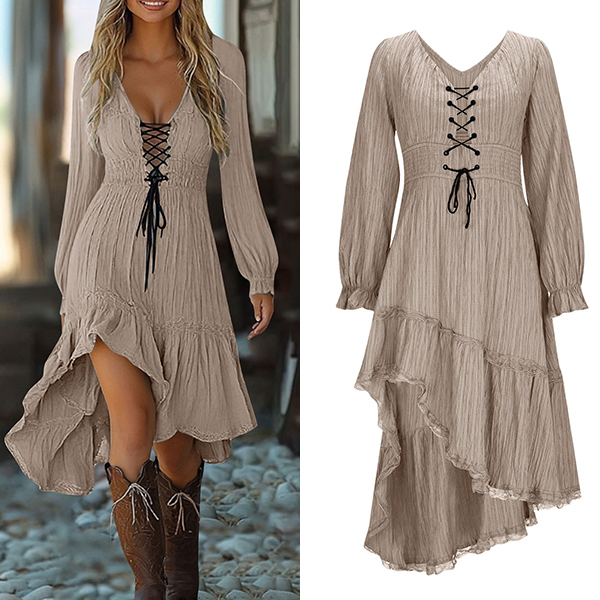 Western Boho Dress - Lace-Up Front with High-Low Ruffle Hem