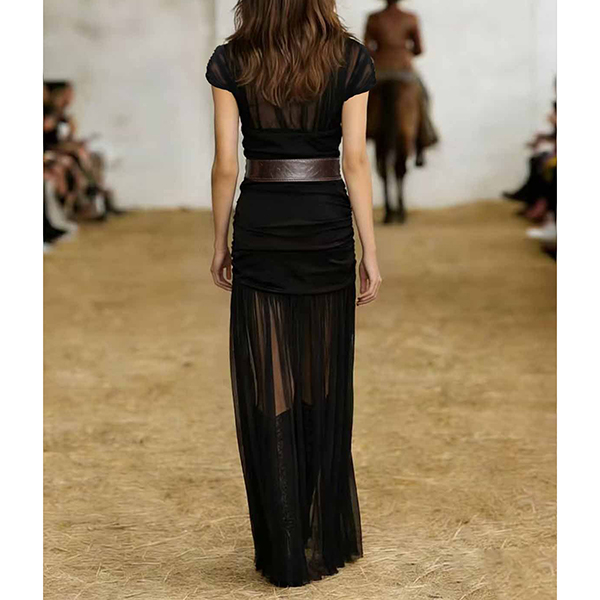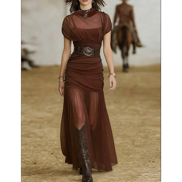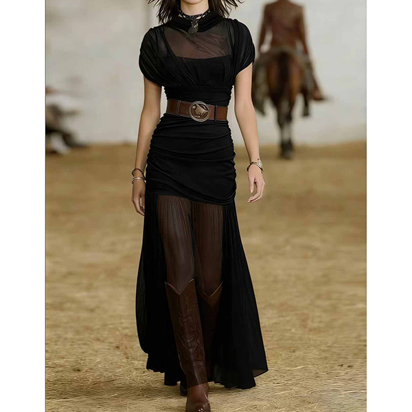 This ethereal dress features romantic western boho styling with delicate sheer construction and graceful mesh overlay for contemporary prairie elegance. The drop waist provides relaxed vintage charm with flattering proportions whilst the sheer flowy hem offers dramatic movement and ethereal grace. Perfect for festival occasions, bohemian styling, or sophisticated prairie coordination.