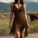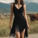 Make a bold statement in this show-stopping bodycon dress that fuses western heritage with modern glamour. The figure-hugging silhouette accentuates your curves while the plunging V-neckline adds sultry sophistication. Dramatic asymmetrical fringe and tassel detailing creates eye-catching movement and texture, swaying beautifully as you walk, dance, or move. Wanna have a try?