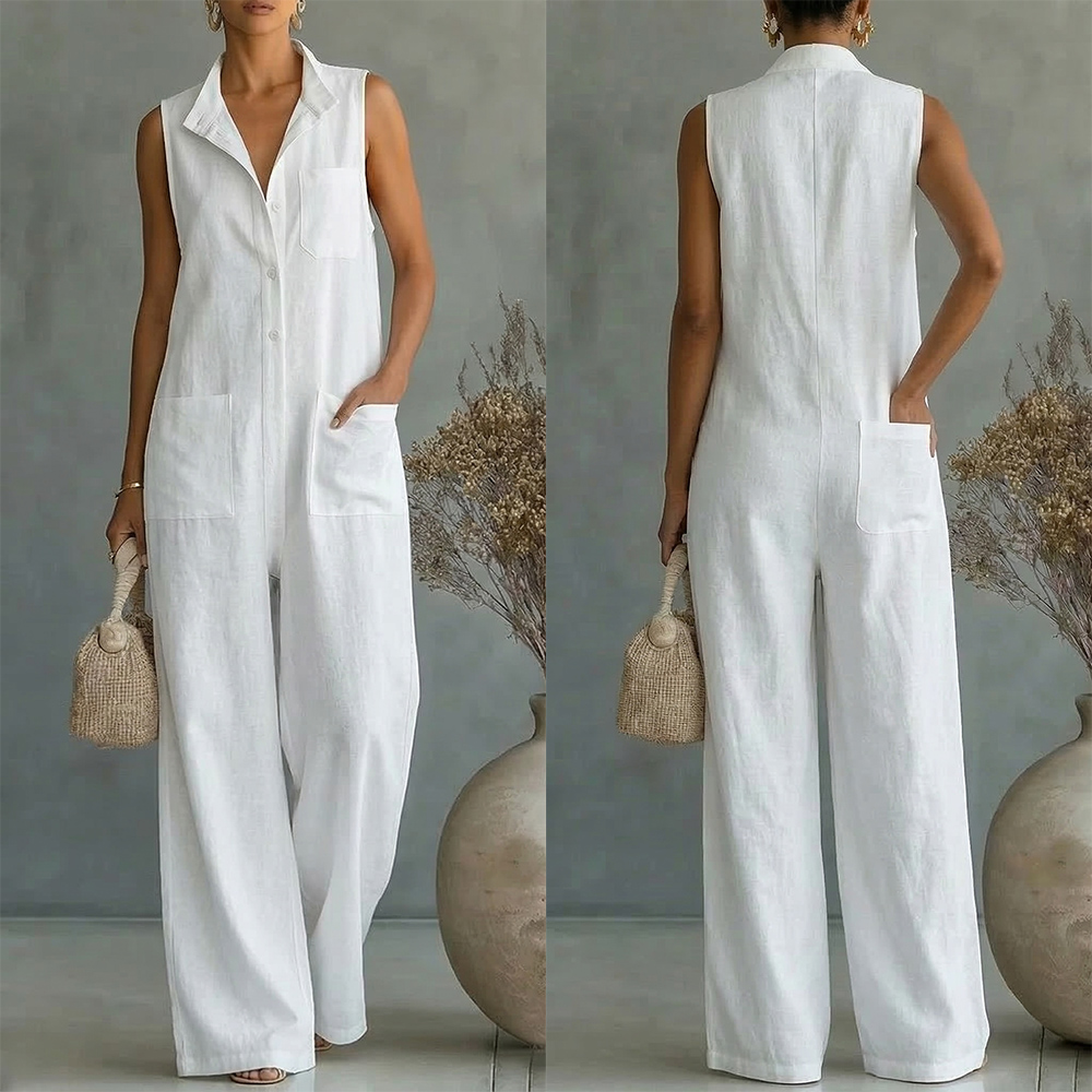 Embrace the freedom of summer with this ultra-relaxed sleeveless jumpsuit. Designed for the modern minimalist, this piece combines the structure of utility wear with the softness of resort attire.