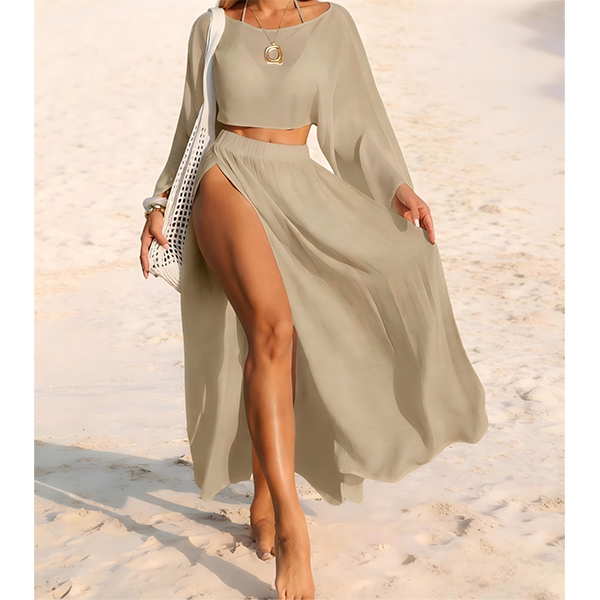 Channel your inner beach goddess with our breathtaking 2-Piece Sheer Maxi Cover-Up Set. Designed to make a statement, this ethereal ensemble features a flowy, long-sleeve crop top and a matching maxi skirt with a dramatic, thigh-high side slit. Crafted from an ultra-lightweight, semi-sheer fabric, it catches the ocean breeze beautifully, creating a stunning silhouette as you walk the shoreline. The elastic waistband ensures a comfortable fit, while the two-piece design offers endless styling possibilities. Wear them together for maximum impact, or mix and match with your favorite bikini separates.