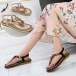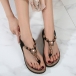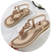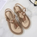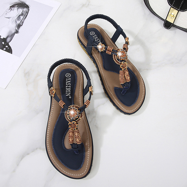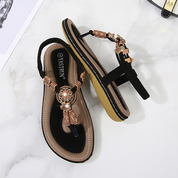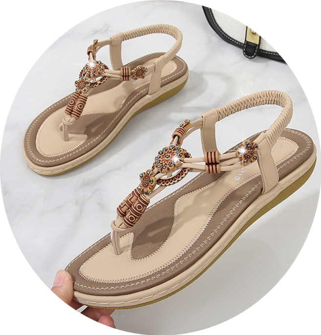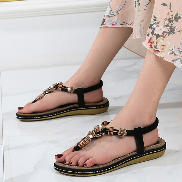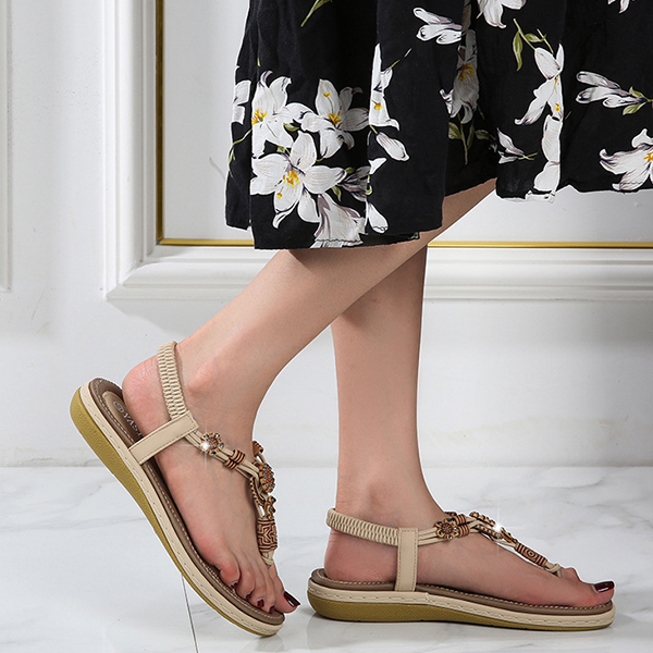 Women's Boho Beaded Flat Sandals - Comfortable Floral T-Strap Summer Beach Shoes with Elastic Ankle Strap