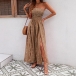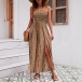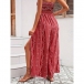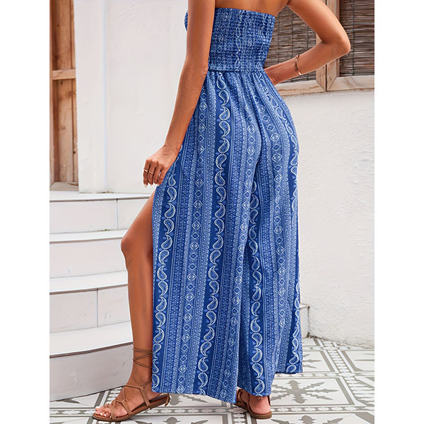 Get ready for sun-soaked days and breezy nights with this stunning boho-chic jumpsuit. Combining the comfort of a maxi dress with the freedom of pants, this piece is a vacation must-have. The stretchy, shirred bodice ensures a secure and comfortable fit for all bust sizes, while the high-waisted design elongates your silhouette. Featuring dramatic high side slits on the wide legs, this jumpsuit offers a breezy feel and a flash of leg as you walk, keeping you cool and stylish. Adorned with a classic paisley print in warm, earthy tones, it captures the essence of 70s retro style and modern wanderlust. Perfect for throwing over a bikini at the beach, exploring a new city, or dancing at a summer music festival.