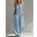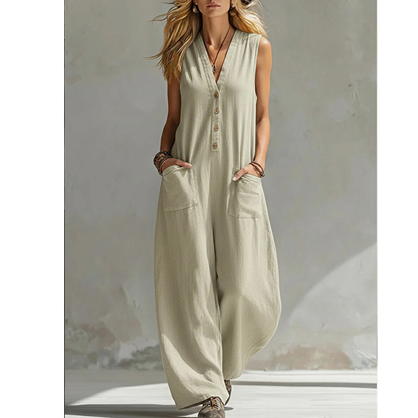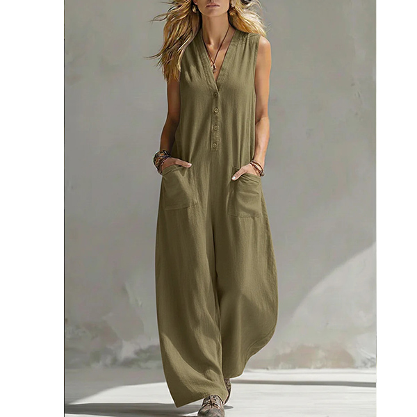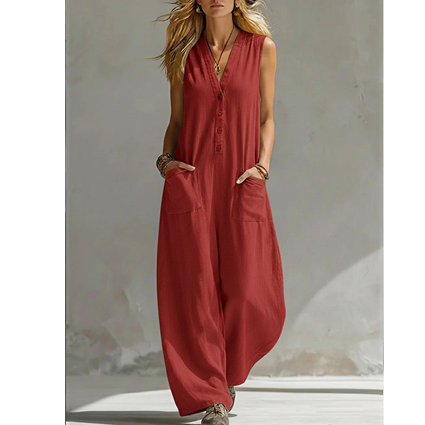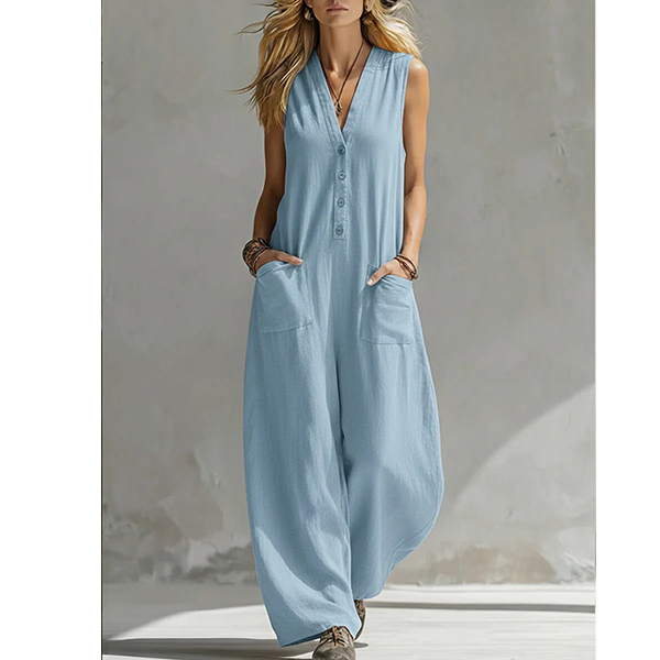 Step into ultimate comfort without sacrificing style with our Breezy Wide-Leg Jumpsuit. A flattering V-neckline is complemented by a classic button-down half placket, adding just the right amount of structure to the relaxed fit. The lightweight, sleeveless design makes it perfect to wear on its own during summer, or layered over a fitted tee for transitional weather. Whether you're strolling through a weekend farmers market, lounging on vacation, or enjoying a casual day out, this jumpsuit is your ticket to effortless summer chic.