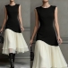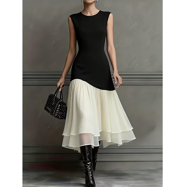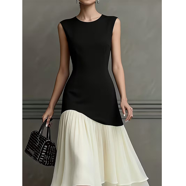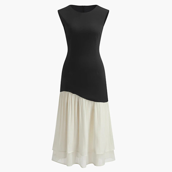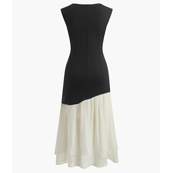 Make a bold statement with this stunning color-block dress, designed for the woman who appreciates modern art and timeless style. The sophisticated black bodice meets a flowing white skirt in a unique diagonal cut. This asymmetrical splicing creates a slimming optical illusion that flatters every curve. Whether you're attending a summer wedding, a corporate event, or a fancy dinner date, this dress ensures you look polished and poised.