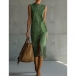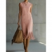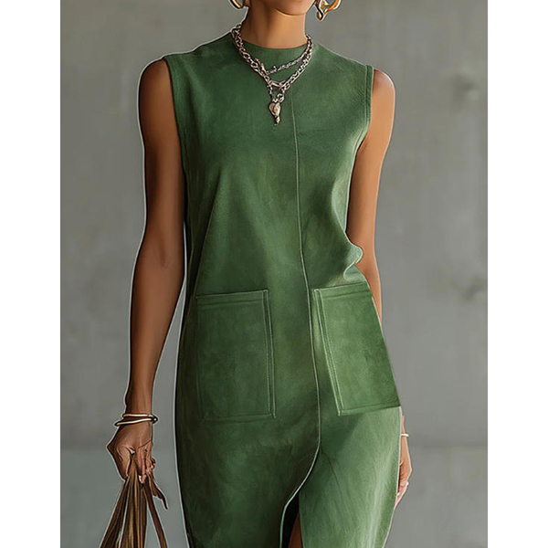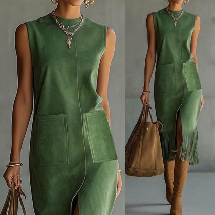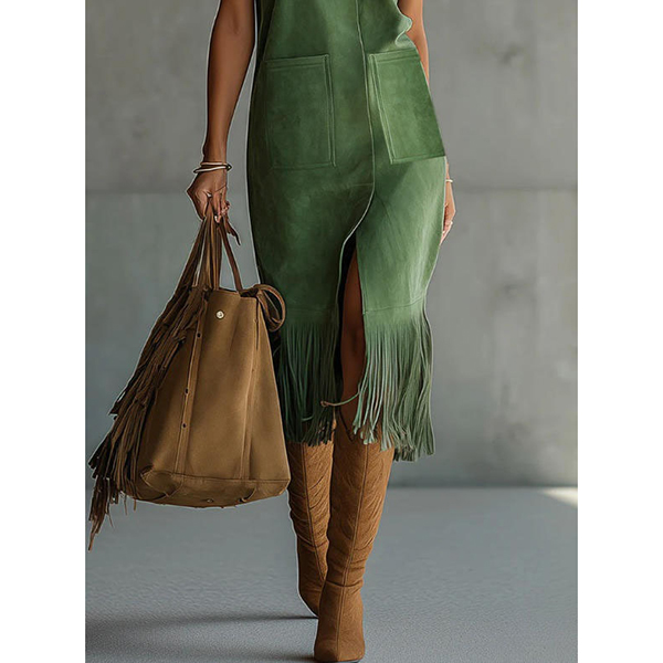 Women's Faux Suede Fringe Midi Dress - Sleeveless Crew Neck Western Boho Shift Dress with Pockets