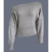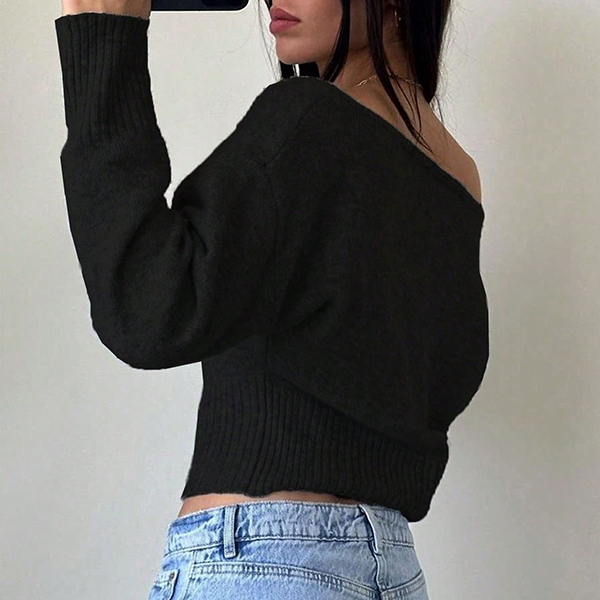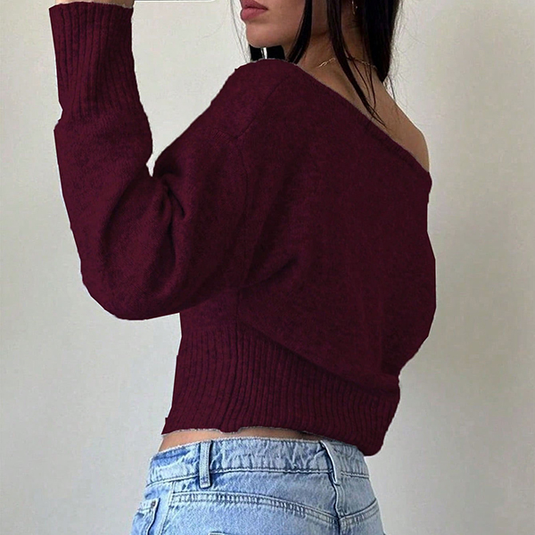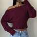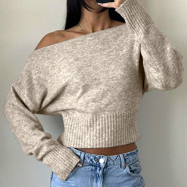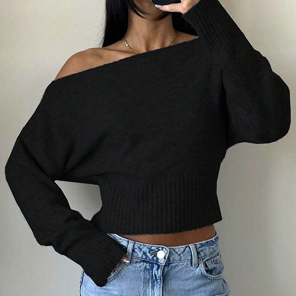 Women's Slouchy One Shoulder Dolman Sleeve Knitted Top -Wide Ribbed Hem Cinched Waist Crop Sweater