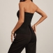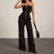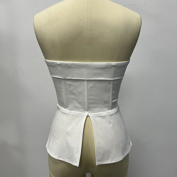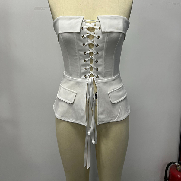 Redefine your evening wardrobe with the 'Midnight' Tailored Corset. This striking top masterfully blends the sultry appeal of traditional corsetry with sharp, menswear-inspired tailoring. Featuring a straight strapless neckline, the bodice is highlighted by a dramatic front lace-up closure with silver hardware and sleek ribbon ties. The structured seaming cinches the waist before flaring out into a chic peplum hem, complete with sophisticated flap pocket details. An open front slit below the lace-up and back slit add a final touch of modern edge. Perfect for creating a powerful, undeniably chic silhouette for your next night out.