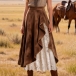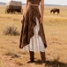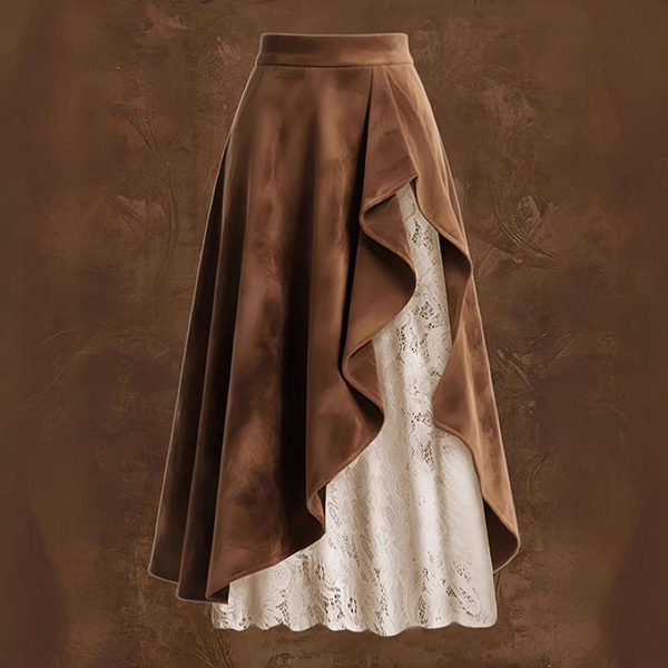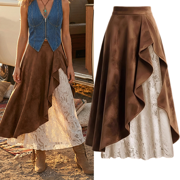 Women's Western Faux Suede Midi Skirt - High Waist Lace Patchwork with Ruffle Hem