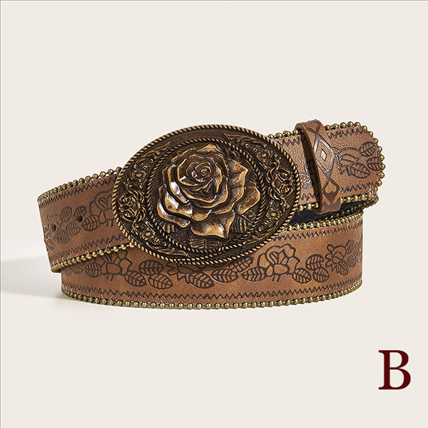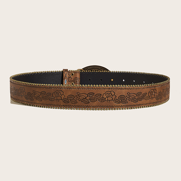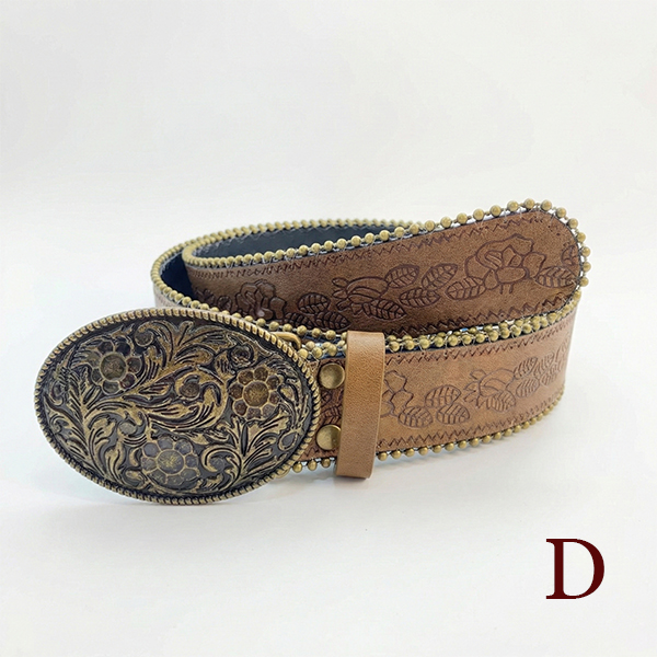 Women's Western Floral Embossed Faux Leather Belt - Y2K Boho Large Metal Buckle Waistband for Jeans/Skirt/Dress