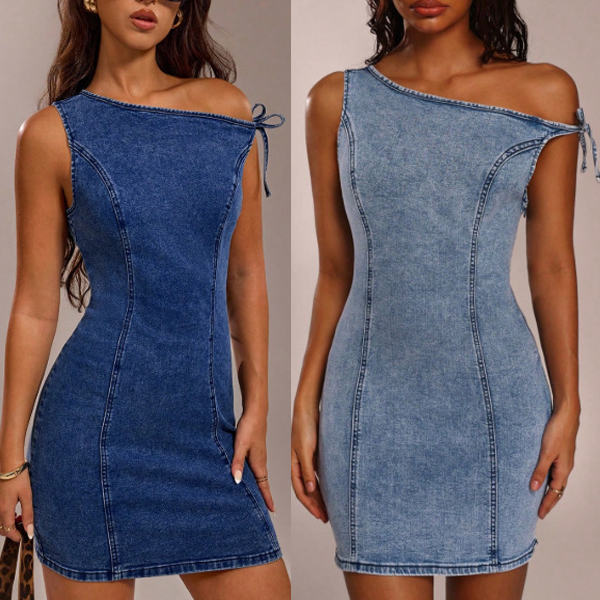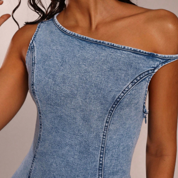 Step into the ultimate Y2K revival with this Asymmetrical Vintage Wash Denim Dress. This striking mini dress combines the structured, cool-girl appeal of denim with a highly feminine, body-skimming silhouette. Featuring a unique slant-shoulder neckline and a delicate side-tie detail, it perfectly frames the decolletage. The dress is expertly crafted with vertical contouring seams that mimic a corset effect, hugging your curves in all the right places. Finished in a retro light-wash, this dress is your new go-to for summer parties, date nights, or stylish weekend outings.